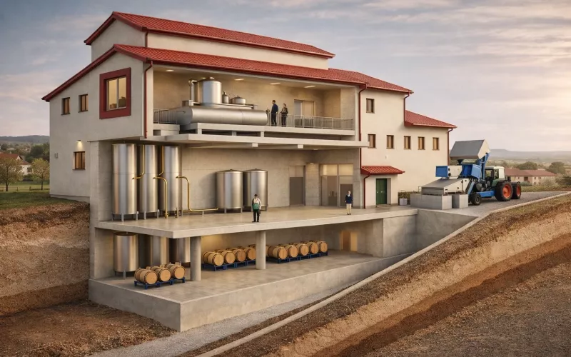 Můžete si krok po kroku projít výrobu od macerace až po hotová vína a zároveň pochopit i vedlejší udržitelné toky, které jsou v grafice součástí celého systému.